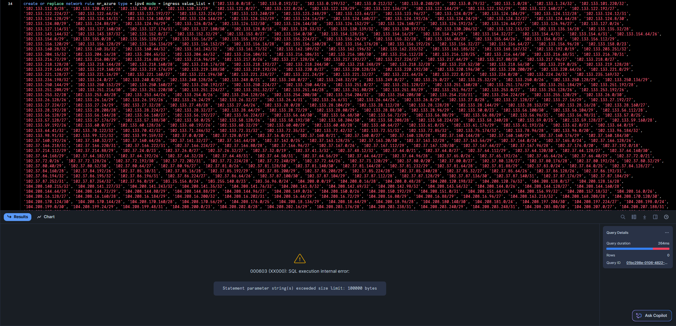 Now, there are currently about 37k IPv42 ranges in the list mentioned above. I tried to add all of them to a single Network Rule, but this returns an (to my knowledge undocumented) error: